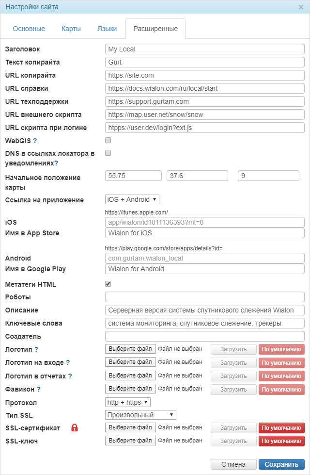 | Протокол | Для работы сайта Logistics по протоколу https необходимо, чтобы по https также работал сайт (Wialon Web или CMS Manager), указанный в поле Базовый URL-адрес на вкладке Основные (т. е. в поле Протокол для него должно быть выбрано http+https или https). |