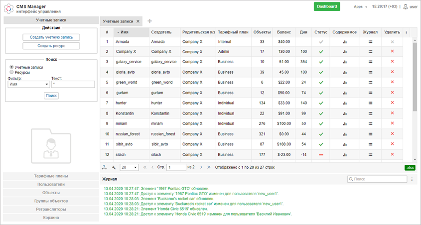 Частично эти же функции доступны и в пользовательском интерфейсе, но отличие CMS Manager состоит в его простоте и удобстве интерфейса, что позволяет работать с большим количеством элементов одновременно, фильтровать их по разным параметрам, представлять в табличном виде с постраничным выводом, создавать закладки с результатами поиска. Кроме того, исключительной привилегией менеджера является возможность работать с учетными записями (и, соответственно, регулировать оплату, ограничивать услуги и задавать их стоимость), а также с ретрансляторами.