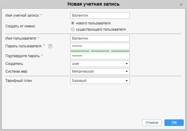 Новый пользователь. Создается новый пользователь, который будет назначен создателем учетной записи. При выборе нового пользователя в следующих полях для него необходимо указать имя (логин) и пароль. По умолчанию предлагается, чтобы его логин совпадал с именем учетной записи, но можно дать пользователю и иное имя. Также в соответствующем поле можно указать создателя для нового пользователя (по умолчанию предлагается текущий пользователь). Кроме того, для нового пользователя можно задать систему мер. Следует отметить, что если создатель нового пользователя не может раздавать тарифные планы (т.е. его учетная запись не является дилером), то блок с тарифными планами становится неактивным.
