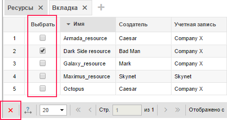 Для удаления ресурса необходимо отметить данный ресурс флагом в соответствующем столбце, а затем нажать кнопку удаления внизу таблицы. Вместе с ресурсом будет удалено и его содержимое (геозоны, задания, уведомления, шаблоны отчетов, водители, прицепы, пассажиры).