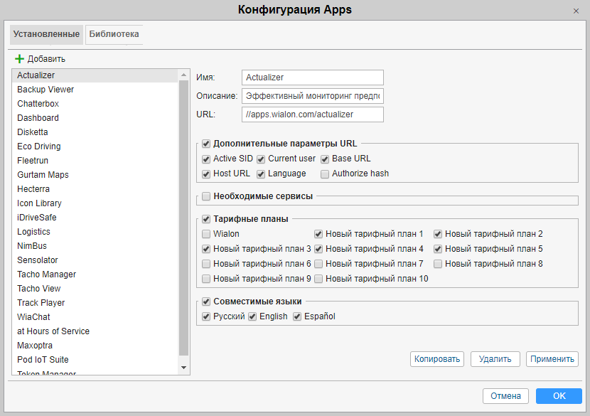 Добавлять приложения может только пользователь верхнего уровня. Для этого в меню пользователя предусмотрен специальный пункт — Конфигурация Apps. Выбрав данный пункт меню, Вы откроете диалоговое окно, которое содержит две вкладки — Установленные и Библиотека. Эти вкладки дают возможность ознакомиться со всеми доступными приложениями, а также сконфигурировать и добавить новые.
