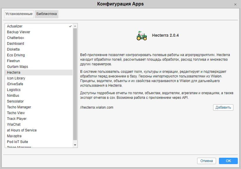 Слева располагается список приложений. Справа от списка находится поле, в котором отображается актуальная информация по приложению, выбранному в списке. Эта информация включает в себя следующее: иконка приложения, его имя, краткое описание, URL-адрес, а также дата выпуска. Чтобы добавить приложение из библиотеки, необходимо выбрать его в списке. Тогда, если данное приложение у Вас еще не установлено, под описанием будет активирована кнопка Добавить.