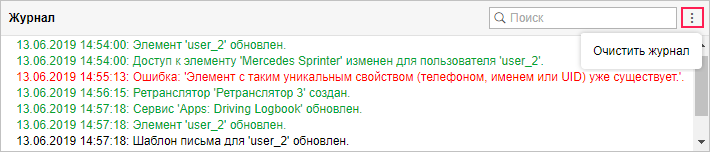 Чтобы очистить журнал от записей, нажмите на иконку настроек в правом верхнем углу и выберите Очистить журнал.