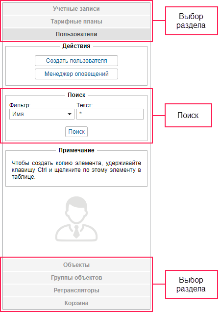 Панель состоит из разделов, каждый из которых соответствует какому-либо элементу системы: Учетные записи, Тарифные планы, Пользователи, Объекты, Группы объектов, Ретрансляторы. Чтобы перемещаться между ними, достаточно просто щелкнуть по названию нужного раздела.