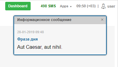 В верхней панели под именем пользователя также могут появляться информационные сообщения от менеджера сервиса, а также уведомления о количестве оставшихся до отключения от системы мониторинга дней. Информационные сообщения отображаются в окошках с синей рамкой, предупреждающие — с красной.