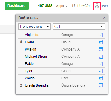 слева от имени. Нажмите на строку необходимого пользователя, чтобы осуществить вход под ним в текущей вкладке, или по иконке в конце строки — чтобы осуществить вход в новой вкладке. Для удобства поиска можно воспользоваться динамическим фильтром. Поиск может осуществляться по пользователям или учетным записям, что регулируется фильтром, расположенным в левом верхнем углу окна.