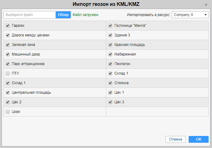 Укажите путь к файлу и нажмите Загрузить. После обработки будет выведено найденное в файле содержимое. Отметьте флагами необходимые элементы и выберите, в какой ресурс импортировать данные. В выпадающем списке показаны только те ресурсы, на которые есть доступ Создание, редактирование и удаление геозон.