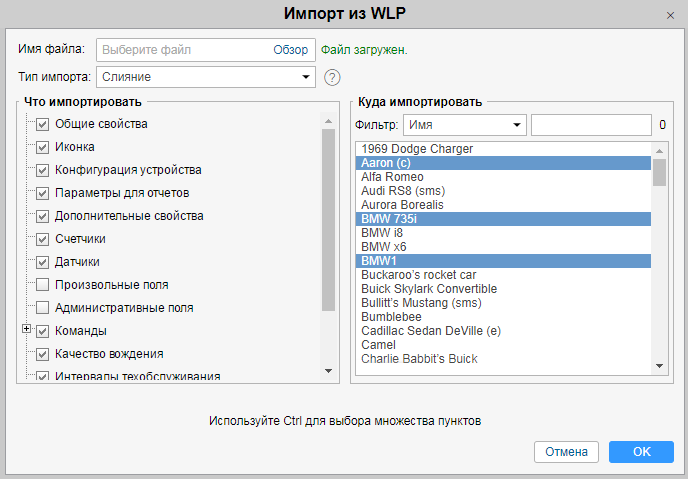 Выберите файл и нажмите Загрузить. Выбранный файл будет обработан, а найденное в нем содержимое будет отображено в секции Что импортировать. Справа, в секции Куда импортировать, появится список элементов соответствующего типа, куда выбранные данные могут быть импортированы.