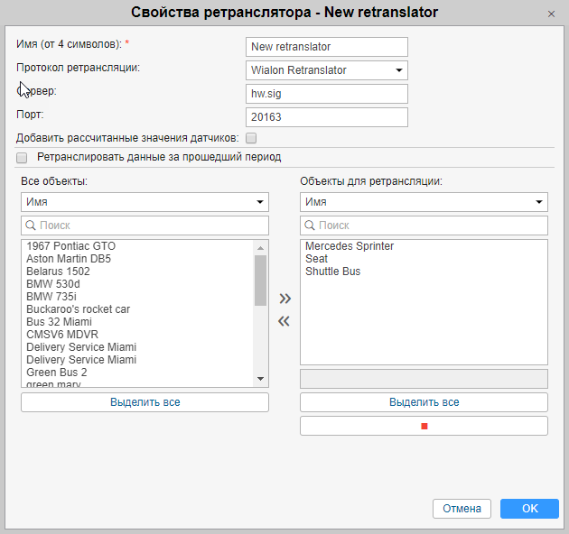 - В диалоге ретранслятора выставить флаг Ретранслировать данные за прошедший период;