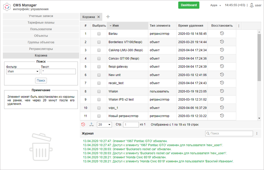 Восстановить элемент из корзины можно не ранее, чем через 20 минут после его удаления. Элемент, после удаления которого не прошло 20 минут, показывается в таблице, но кнопка Восстановить для него неактивна.