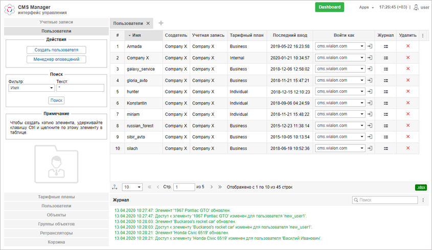 На панели находится кнопка Создать группу объектов, а также фильтр поиска. В таблице результатов справа отображается имя группы, присвоенная иконка, создатель, учетная запись, количество объектов и иконка открытия диалогового окна журнала. О процессе создания, копирования, просмотра, редактирования и удаления элементов в интерфейсе управления можно узнать из раздела Стандартные операции.