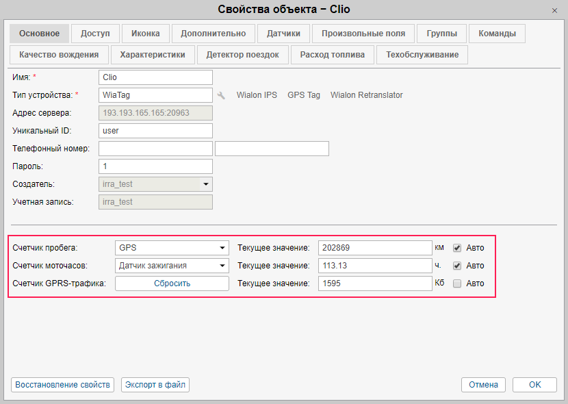 На вкладке Основное, кроме прочих свойств, задаются параметры счетчиков пробега, моточасов и трафика GPRS.
