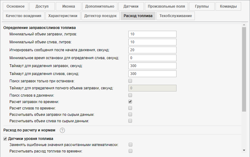 Определение сливов/заправок топлива возможно только при наличии у объекта датчиков уровня топлива и активированной опции Датчики уровня топлива. Расчет расхода топлива производится при наличии датчиков расхода топлива. Точность определения напрямую зависит от точности установленных датчиков, а также от корректности их настройки. При расчетах используются параметры, настроенные на данной вкладке. Для удобства параметры разделены на категории (секции).