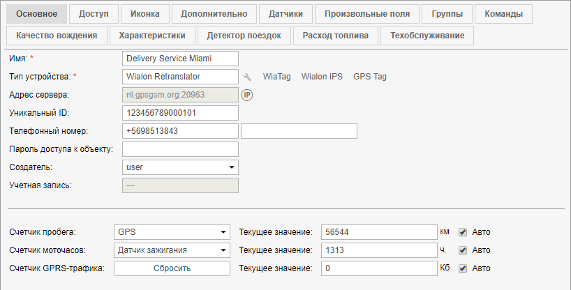 Объекты с одинаковыми ID в рамках одного типа оборудования, а также объекты или водители с одинаковыми телефонными номерами не могут существовать в системе. Если Вы пытаетесь создать объект с ID или телефонным номером, которые уже используются в системе, будет выведено специальное предупреждение. Однако объект все равно будет создан, только значение данных полей будет обнулено. Эти поля можно будет отредактировать позже.