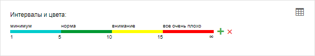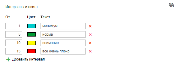 По завершении на шкале отобразятся указанные Вами интервалы выбранного цвета, сверху интервала — введенный текст. Каждый интервал шкалы, его цвет и текст можно отредактировать. Для этого кликните по соответствующему интервалу шкалы и введите необходимые параметры. Чтобы удалить все введенные интервалы со шкалы, нажмите кнопку удаления справа от нее.