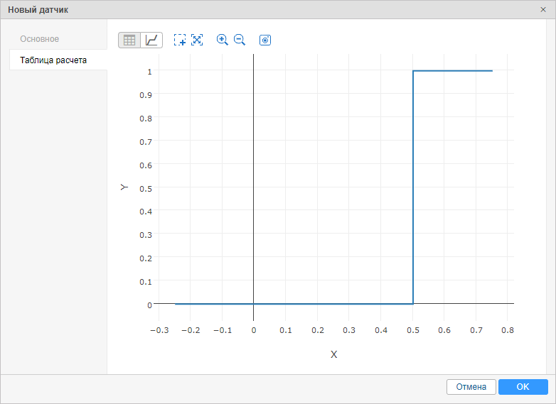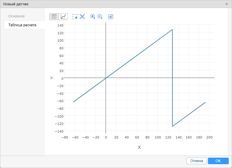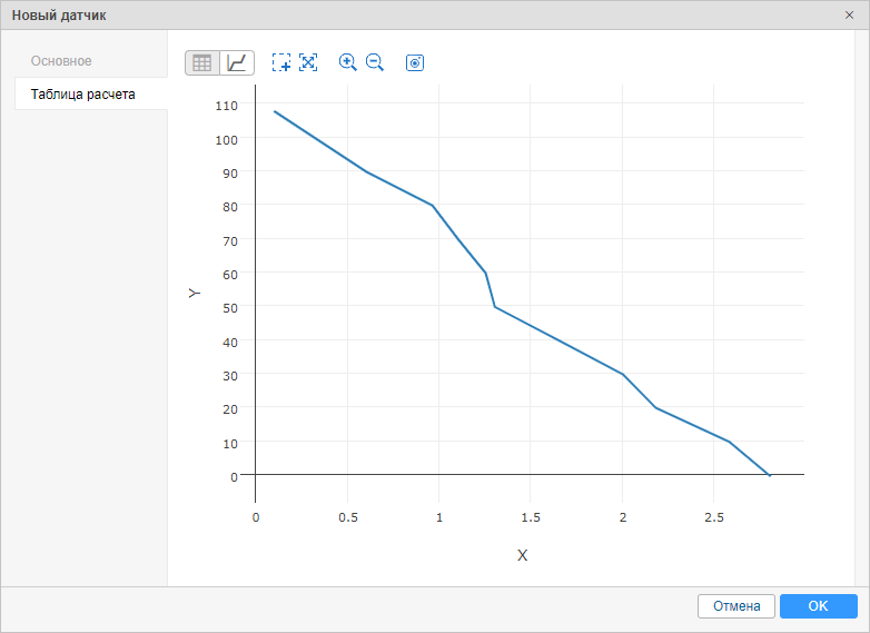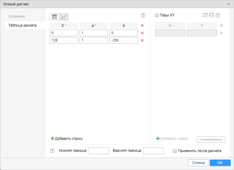 Мастер таблицы расчета — это инструмент, который упрощает процесс создания таблицы преобразования значений для датчика. Здесь достаточно ввести входные значения X и соответствующие им выходные значения Y. Мастер таблицы расчета располагается в правой части диалогового окна. По умолчанию он неактивен. Чтобы воспользоваться данным инструментом, необходимо активировать флаг Пары XY.
