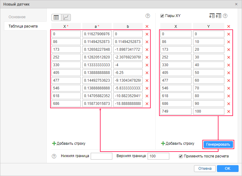 Пары значений внести в мастер таблицы расчета, кликнуть Генерировать. На основании введенных значений будет сгенерирована таблица расчета (слева).