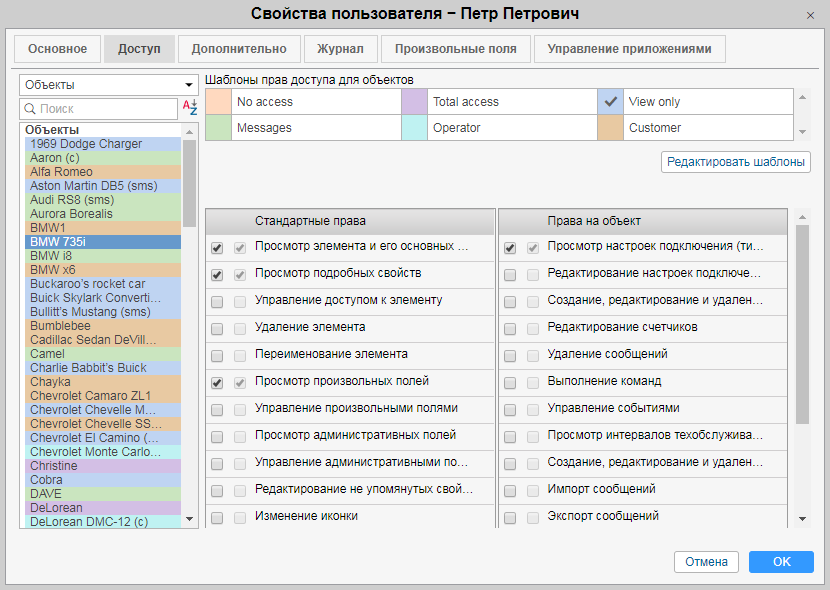 На вкладке Доступ диалога свойств пользователя можно дать редактируемому пользователю доступ на различные элементы системы — объекты, группы объектов, ресурсы, маршруты, а также на других пользователей.