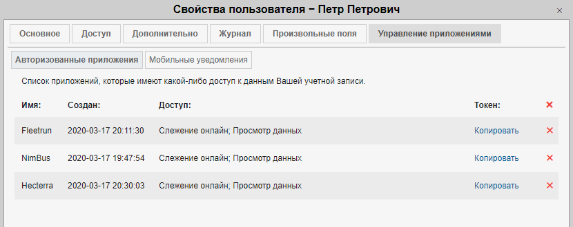 На данной вкладке представлен список приложений, которые могут отправлять уведомления на Ваши мобильные устройства. Слева располагается название приложения, справа — перечень устройств. Чтобы запретить приложению отправку мобильных уведомлений, необходимо удалить его из списка (красный крест в конце строки).