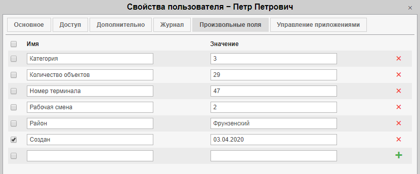 На данной вкладке можно добавить любую информацию о пользователе, будь то его домашний адрес или его рост. В левом поле введите название поля, в правом — его значение. Для сохранения пользовательского поля нажимайте кнопку Добавить, для удаления — Удалить. В конце редактирования диалога нажмите ОК в правом нижнем углу. При следующем открытии диалога, поля будут автоматически отсортированы по алфавиту. Часть полей можно пометить как «административные» (кнопка-флаг перед полем), т. е. они будут видны только пользователям с соответствующими правами.
