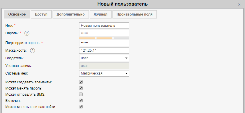 Свойства пользователя задаются при его создании, редактировании и копировании в специальном диалоге на нескольких вкладках. Доступность тех или иных вкладок и полей, а также возможные действия с ними зависят от уровня прав доступа. Вкладки Основное и Дополнительно доступны всегда. Некоторые настройки могут стать недоступными для редактирования также в том случае, если учетная запись пользователя заблокирована.