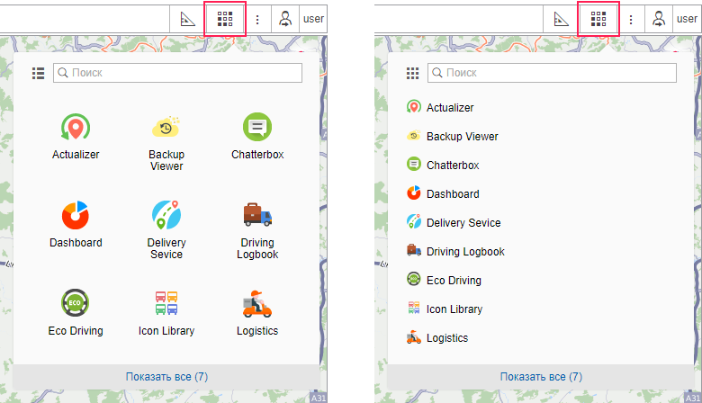 Приложение может быть открыто как в новой вкладке браузера, так и в отдельном окне поверх Wialon. Для того чтобы открыть приложение в новой вкладке, щелкните по его логотипу (названию). Если же его необходимо открыть поверх Wialon, используйте кнопку