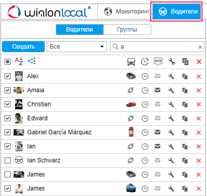 Для работы с водителями щелкните по заголовку Водители в верхней панели либо выберите соответствующий пункт в окне настройки меню. Затем выберите режим, который позволит работать с водителями или группами водителей.
