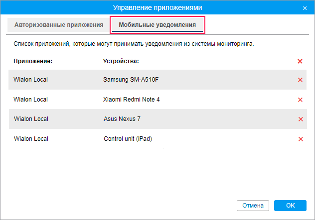 В окне Управление приложениями показывается список приложений, которые имеют доступ к вашей учетной записи, а также список устройств, которые могут принимать мобильные уведомления из Wialon. Эти списки формируются автоматически после входа в приложение.