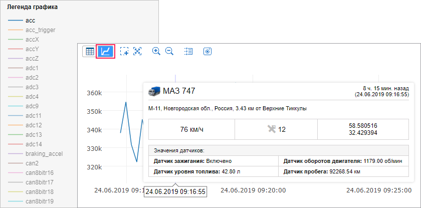 На месте таблицы с сообщениями появится график, который можно масштабировать при помощи мыши. Для этого выделите необходимый фрагмент, удерживая левую кнопку мыши. Наведите указатель мыши на ключевые узлы на графике, чтобы получить значение в указанной точке. Используйте синие стрелки в панели навигации для перемещения между страницами графика.