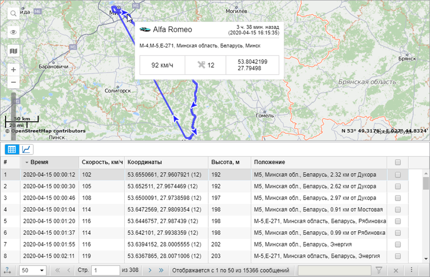 Если вы запросили сообщения с данными, то таблица сообщений будет содержать информацию о времени сообщения, скорости движения в момент отправки сообщения, местоположении объекта и доступных параметрах. Кроме того, в разделе Статистика можно найти суммарную информацию. Там будет указано количество найденных по запросу сообщений, время от первого до последнего сообщения, пройденное расстояние, средняя и максимальная скорость. Пробег в сообщениях в некоторых случаях может отличаться от пробега в отчетах (если на интервале присутствуют невалидные данные). В таких случаях более точным следует считать пробег в отчетах.