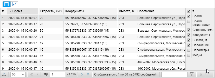 Параметры — значения параметров всех доступных датчиков. Сообщения можно фильтровать по параметрам. Вместо одного столбца параметров могут выводиться столбцы с датчиками.