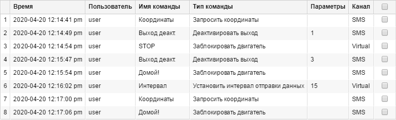 Канал — тип связи, который был использован для выполнения команды (TCP, UDP, Virtual, SMS).