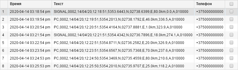 SMS-сообщения могут отправляться объектом при выполнении команд, тревоге и в прочих случаях, которые зависят от типа устройства. Таблица, сгенерированная по данному типу запроса, содержит три графы: время отправки сообщения, текст сообщения и телефонный номер SIM-карты, встроенной в объект, с которой сообщение было отправлено. Сообщения можно фильтровать по тексту.