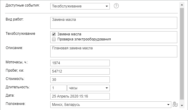 Для регистрации техобслуживание выберите соответствующее событие в выпадающем списке и заполните необходимые поля.