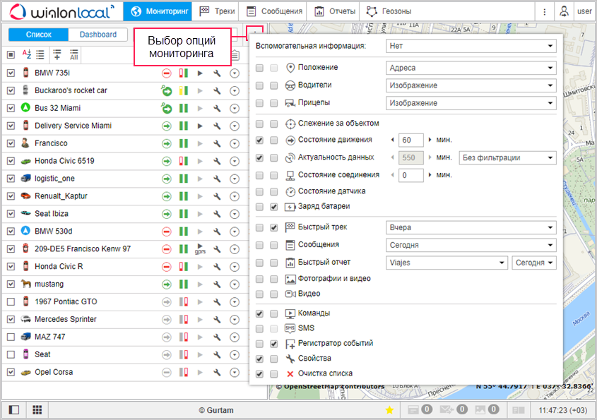 По актуальности последнего сообщения можно настроить фильтрацию объектов в панели мониторинга и/или на карте. Для этого в выпадающем списке замените пункт Без фильтрации на Панель мониторинга либо Панель + карта и слева укажите интервал фильтрации в минутах. Тогда в панели мониторинга и, возможно, на карте объекты будут динамически появляться и исчезать в зависимости от актуальности их данных. Подробнее…