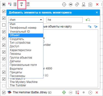 При наличии большого количества объектов/групп для быстрого поиска нужного элемента можно воспользоваться специальными фильтрами. Выпадающий список содержит ряд критериев поиска: имя, создатель, присутствие в геозоне, имеющиеся датчики, водитель, управляющий транспортным средством, прицеп или пассажир, прикрепленные к объекту и др.