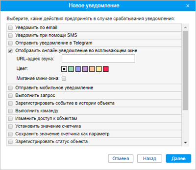 В диалоговом окне создания уведомления можно указать способ действия, то есть то, что должна сделать система в случае срабатывания уведомления.