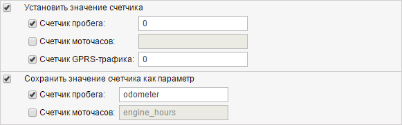 Например, при въезде в условленную геозону можно изменить (скажем, обнулить) значения счетчиков пробега, моточасов и/или трафика. Отметьте нужные счетчики и задайте им необходимые значения напротив. Для успешного выполнения необходимо право Редактирование счетчиков. Подробнее о счетчиках.