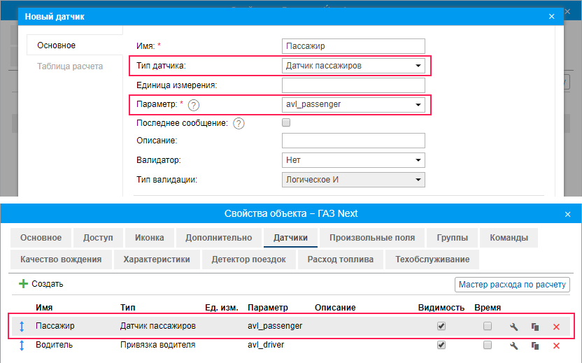 - У всех объектов, на которые предполагается прикреплять пассажиров, должен быть создан датчик типа Датчик пассажиров. Параметр для этого датчика зависит от используемого оборудования и его настройки.