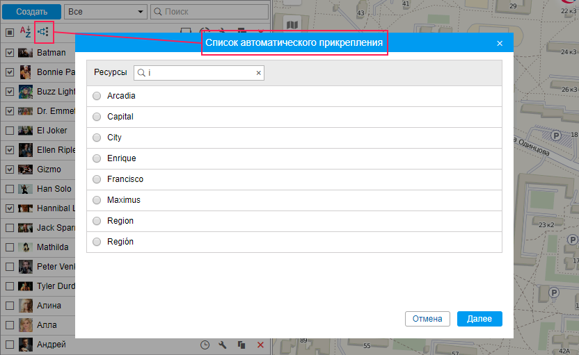 В данном диалоге необходимо выбрать ресурс, пассажиры которого будут использоваться для автоматического прикрепления к объектам (выбираются в следующем диалоге). Чтобы оценить, какие конкретно пассажиры входят в тот или иной ресурс, вернитесь в панель пассажиров и примените фильтр по ресурсу (выпадающий список справа от кнопки Создать).