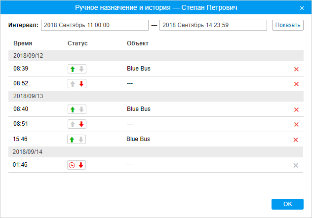 Статус пассажира (за исключением статуса Снятие по таймауту) можно изменить вручную щелчком по необходимому указателю. Для удаления назначение или снятие из истории, нажмите на