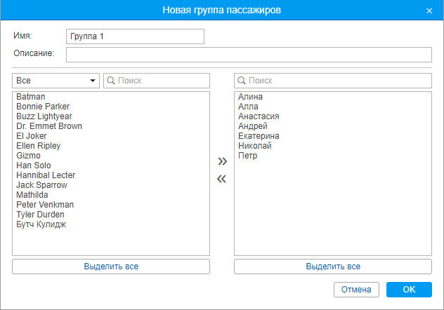 Для создания новой группы нажмите кнопку Создать. Введите имя и описание. Выбор пассажиров осуществляется в списке слева. В нем, в зависимости от выбранного варианта в фильтре выше, могут быть показаны все пассажиры, пассажиры из определенной группы (названия групп заключены в квадратные скобки) или пассажиры вне групп. Переместите необходимые элементы в правый список посредством двойных кликов или кнопки Добавить (стрелки вправо). Нажмите ОК.