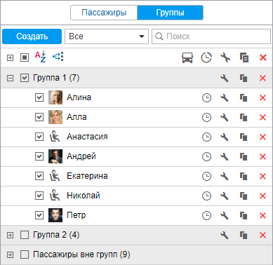 Для пассажиров, входящих в группы, доступен ряд стандартных действий (необходимо раскрыть группу для отображения соответствующих кнопок).