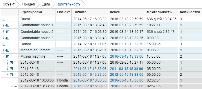 Таблица Назначения показывает, когда и на какие объекты назначался прицеп, сколько длились его рабочие интервалы, пройденное расстояние и т.п. Параметры этой таблицы и возможные столбцы такие же, как и в аналогичной таблице для водителей, за исключением того, что нет столбца Нарушения и столбцов с информацией о моточасах. Эта таблица также доступна и для группы прицепов, где есть возможность построения сложных отчетов до 4 уровней вложенности (прицепы –> объекты –> даты/недели/месяцы –> единичные назначения).