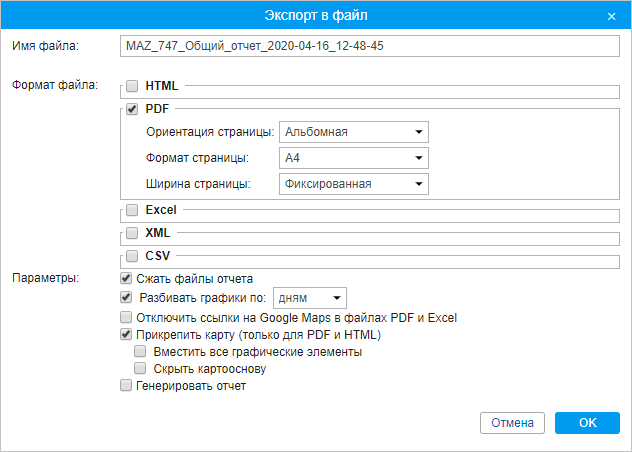 Здесь необходимо указать формат (или несколько форматов) файла, который вы хотите получить. Возможные варианты: HTML, PDF, Еxcel, XML, CSV. Для некоторых форматов может понадобиться указать дополнительные параметры экспорта.