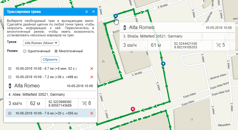 Если выбран многоточечный режим, на треке может быть помечено несколько точек одновременно. Активная (выбранная) точка выделяется синим маркером, остальные точки — красным. Кроме того, активная точка подсвечивается в таблице голубым цветом. Навигация между точками осуществляется как методом клика по маркеру точки, так и по необходимой строке в таблице. В таблице указано расстояние от начальной точки трека, а в скобках — смещение по времени и расстоянию от предыдущей установленной точки.