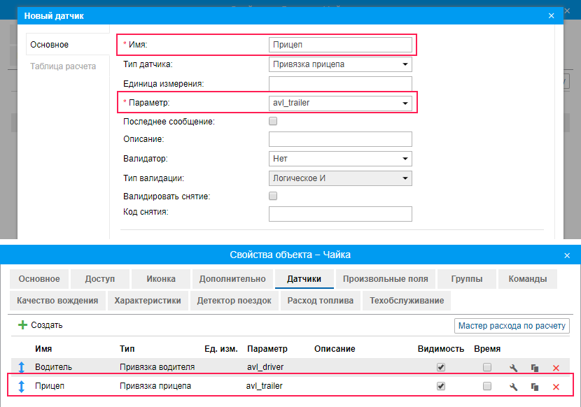 1. У всех объектов, к которым предполагается прикреплять прицепы автоматически, должен быть создан датчик типа Привязка прицепа. Параметр для этого датчика может быть avl_driver или другой, что зависит от используемого оборудования и его настройки.
