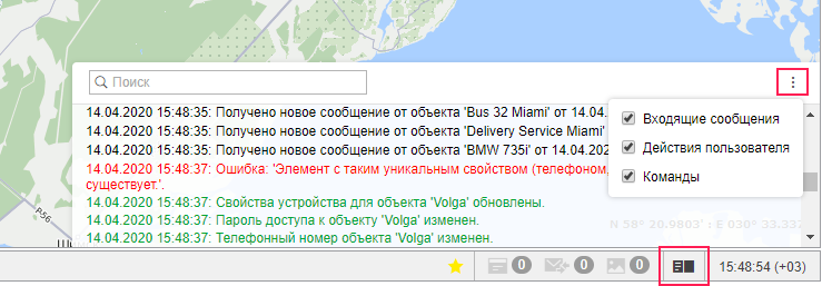 В правом нижнем углу экрана доступен журнал, который открывается нажатием на иконку в нижней панели. В нем показывается информация о действиях пользователя, выполнении команд и получении сообщений от объектов из рабочего списка панели мониторинга.