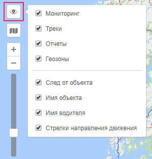 Графические слои панелей можно включать только при наличии в главном меню панелей с таким же названием. Например, если в главном меню есть пункт Мониторинг, на карте может быть показан графический слой с положением выбранных объектов. При добавлении пункта в главное меню его слой автоматически появляется на карте, при удалении пункта — слой исчезает.