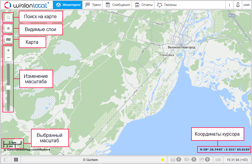 В нижнем левом углу карты указывается текущий масштаб, в котором отображается карта. В правом нижнем углу показываются географические координаты, на которые указывает курсор мыши. Формат отображения координат выбирается в настройках пользователя (градусы либо градусы и минуты).